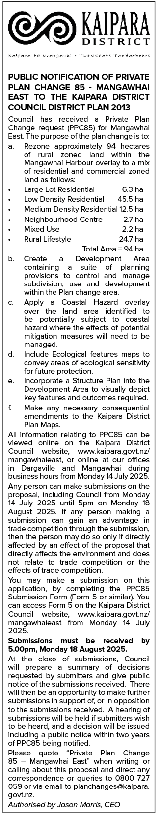- Notification of submission period open for Private Plan Change 85 Mangawhai East - Kaipara Lifestyler 15 July 2025