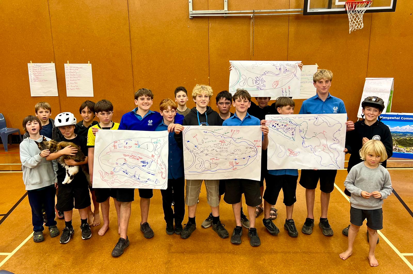 KDC’s Strategy & Engagement and Parks teams then worked with local riders – the young people who love to ride in the area – and their families to plan a workshop for sharing ideas, following which KDC and 34 mountain biking enthusiasts came together at Mangawhai Beach School with the aim of collaborating on ideas for an off-road bike path in the area.