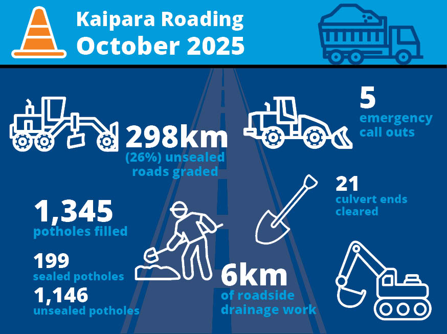 Works on unsealed roads generally quieten down over summer – though there are strengthening works programmed for the unsealed network in November. During the dry summer months, graders will be opening up roadside drains.